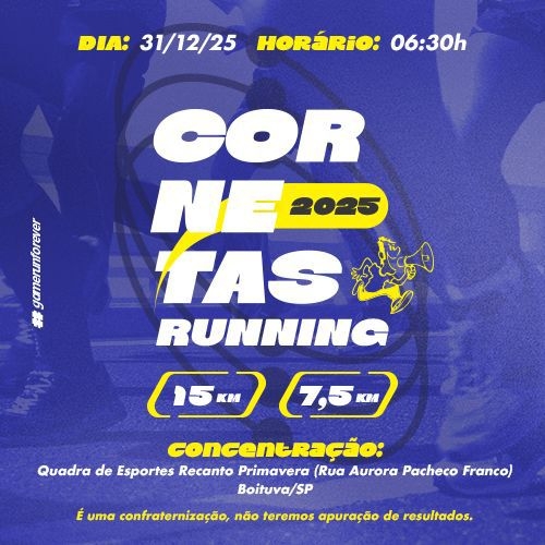 Retirada de Kits: A entrega dos kits será definida e informada nos canais oficiais do Grupo Cornetas Running com antecedência, mas ocorrerá nos dias 29 e 30 de dezembro na cidade de Boituva. |