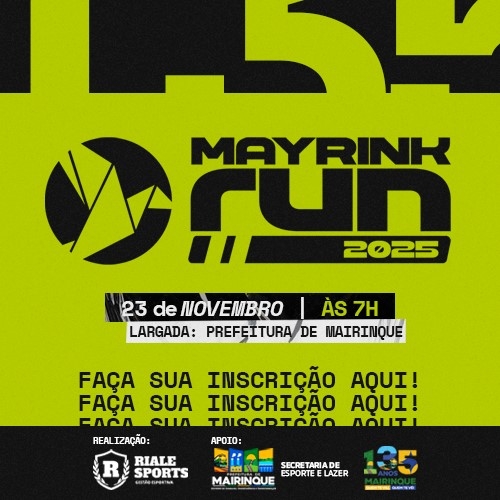 1.1 A Prova de Pedestrianismo Corrida e Caminhada – Mayrink Run, doravante denominada, EVENTO, acontecerá no dia 23 de novembro de 2025, na cidade de Mairinque, no endereço Avenida Dr. Lamartine Navarro, Centro, Mairinque - SP, Brasil, por PESSOAS DE AMBOS OS SEXOS devidamente inscritos, doravante denominados ATLETAS, independentemente da condição climática.
