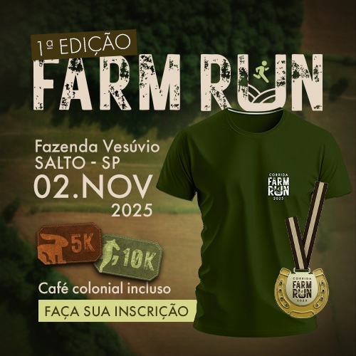 1.2- 1ª Edição Farm Run será realizada na Fazenda Vesúvio em Salto SP, dia 02/11/2025, com a distância da corrida 5km e 10km, com largada às 7h00min. Orientamos chegar uma hora